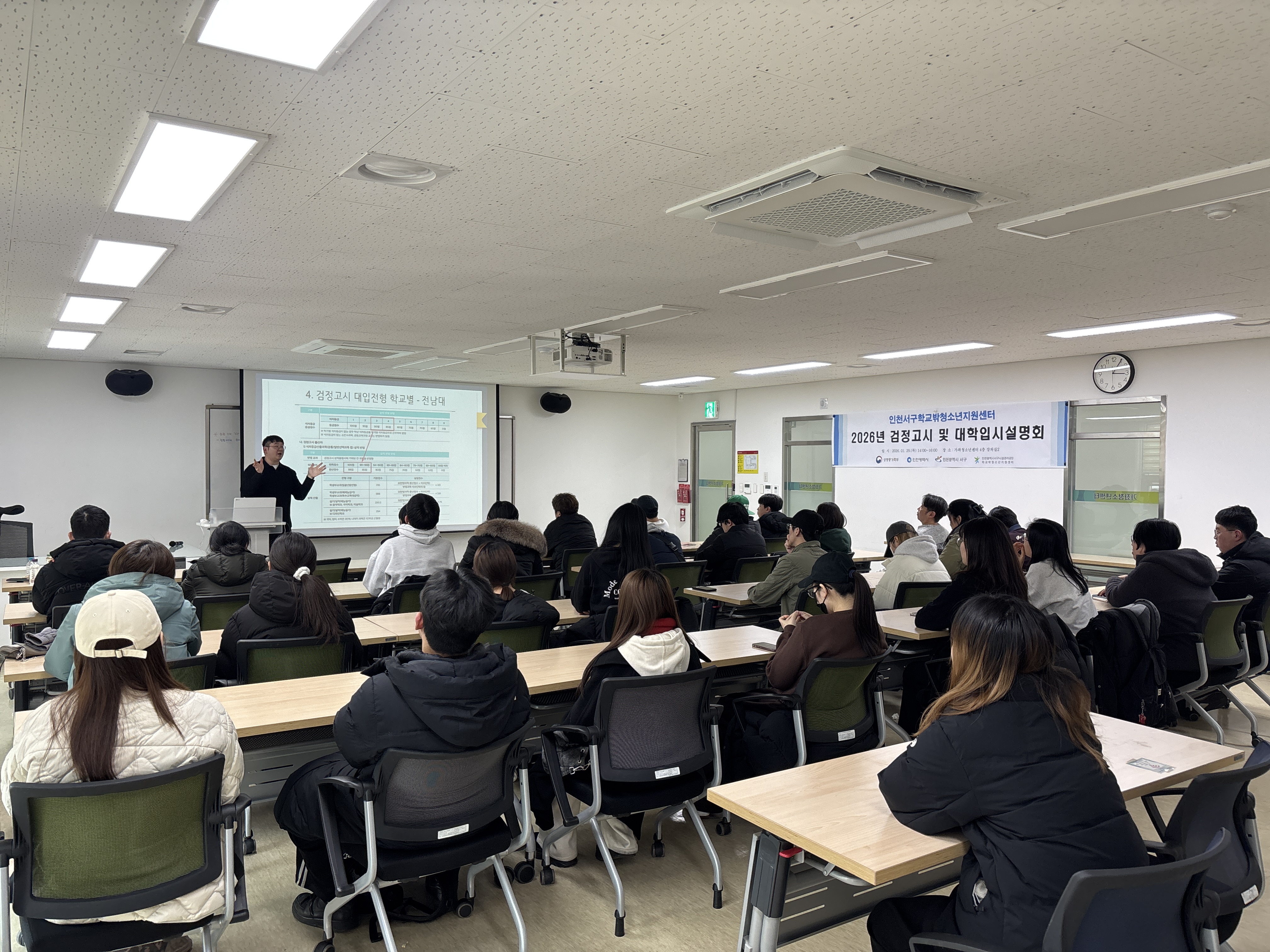 (인천=국제뉴스) 문연수 기자 = 인천 서구(구청장 강범석)가 지원하는 서구시설관리공단(이사장 우영환) 서구학교밖청소년지원센터(이하 서구꿈드림)는 1월 29일 학교 밖 청소년 및 보호자 33명이 참석한 가운데 '검정고시 및 대학입시설명회'를 실시했다.